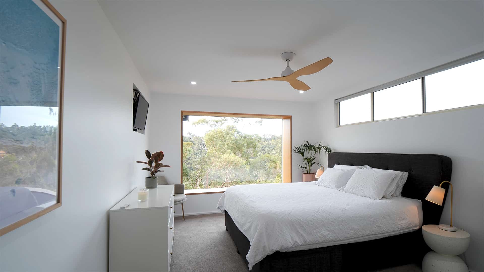 This project required a huge amount of work to create a top floor addition of a master bedroom, a Laminex feature wall, walk-in wardrobe and an impressive double glazed fixed bay window built with solid oak reveal and a hidden electric blind to maximise views of leafy Bonnet Bay below. Externally, we used James Hardie linea cladding.